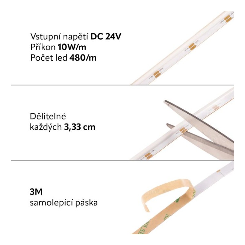 COB LED pásek s bočním svitem je vhodný pro nasvícení hran se svitem dopředu. Svojí konstrukcí je také vhodný pro nasvícení oblých a ostrých tvarů. Díky COB technologii nejsou viditelné jednotlivé body a LED pásek vytvárí kontinuální světelnou čáru.
