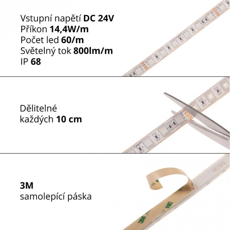 24V RGB LED pásek v krytí IP68 prodáváme pouze na celé metry. LED pásek je vždy dodáván s koncovkou na pásku a napájenými kabely. K LED pásku doporučujeme dokoupit koncovku 12IP68, kterou v případě ustřižení LED pásku použijete. Pro zachování IP krytí je nutné koncovku zalepit například pomocí silikonu. Originální 10m návin má napájen kabely z obou stran. Díky nízké spotřebě, malým rozměrům a snadné montáži je možné LED pásek využít jako osvětlení pro kuchyňské linky, v šatnách, na schodištích, do podhledů apod.