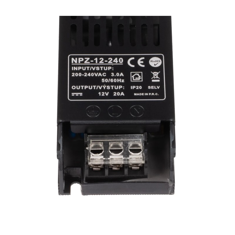 LED elektronický spínaný zdroj (trafo) 12V 240W v krytí IP20 je určený pro vnitřní použití. Vhodné pro nízkonapěťové LED produkty jako jsou například LED pásky, LED žárovky a další LED osvětlení.