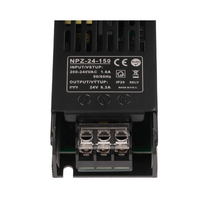 LED elektronický spínaný zdroj (trafo) 24V 150W v krytí IP20 je určený pro vnitřní použití. Vhodné pro nízkonapěťové LED produkty jako jsou například LED pásky, LED žárovky a další LED osvětlení.