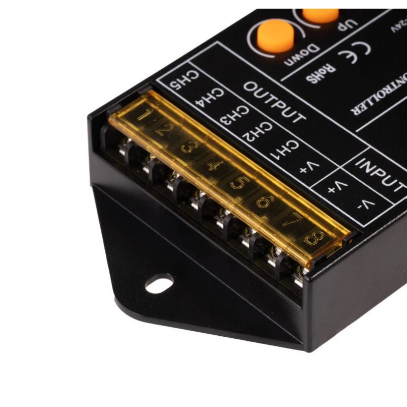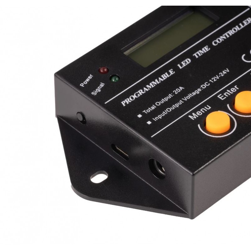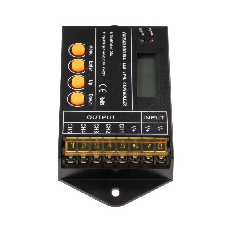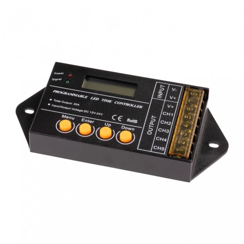 Programovatelný časový ovladač pro LED osvětlení s možností nastavení času, intenzity a mixování kanálů nezávisle na sobě v 5ti nezávislých sekcích v časové ose. Využití zejména pro osvětlení akvárií, terárií či různých světelných efektů.