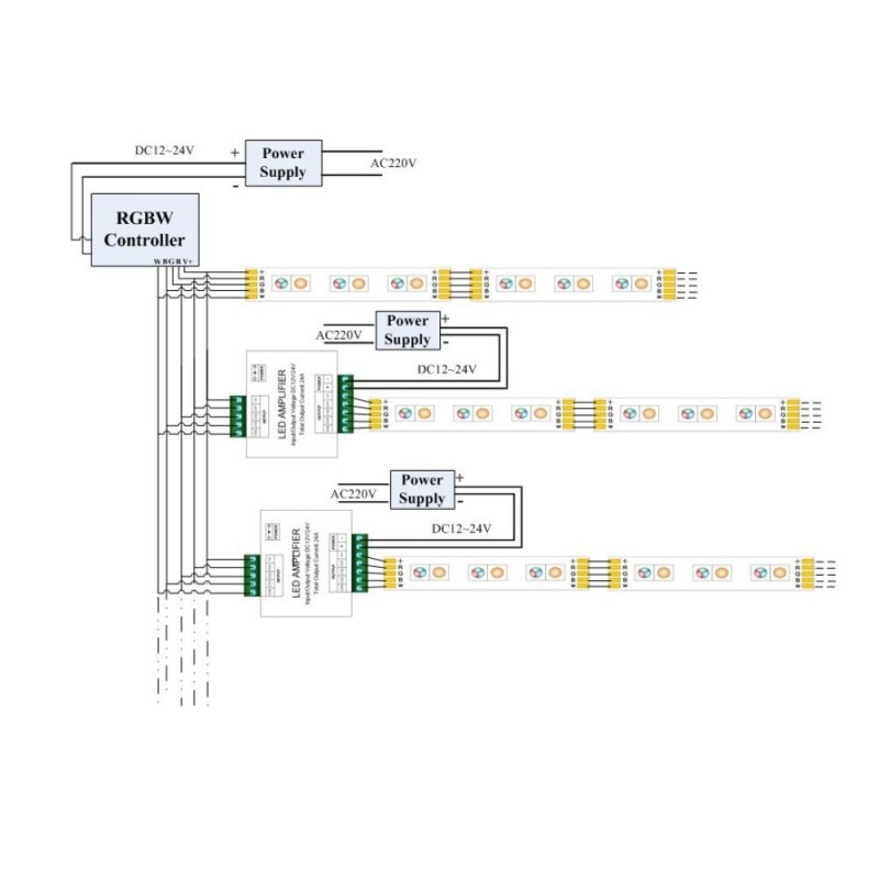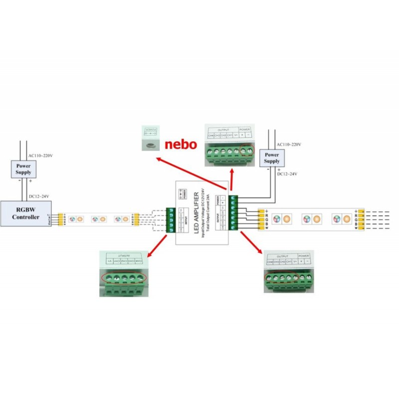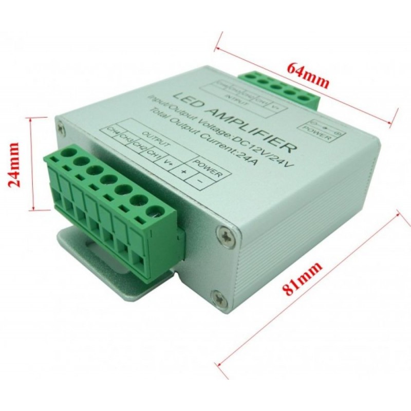 Zesilovač čtyřkanálový RGBW signálu RGBW LED pásků a modulů. Slouží k rozšíření výkonů LED ovladačů nad jejich přípustné zatížení. (Například k ovladači s max. zatížením 72W připojením zesilovače přidáte další úsek o 288W. Pozor, hodnoty se nesčítají. Na zesilovač můžete připojit pouze doporučené zatížení.)