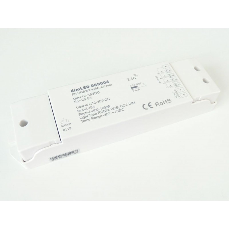 RGBW RF přijímač stmívač LED 4x5A 12-36VDC pro RGBW ovladače dimLED