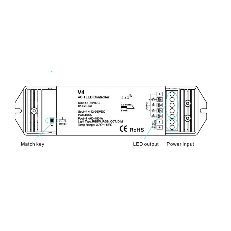 Radiofrekvenční přijímač stmívač pro RGBW LED produkty. Přijímač může být ukrytý (za zdí, sádrokartónem či ve skříni), není nutná přímá viditelnost přijímače pro ovladač.