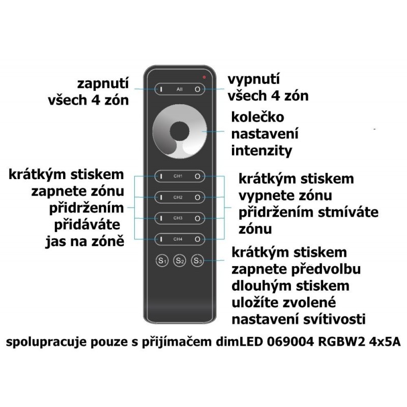 Dálkový ovladač dimLED OV 4KL je bezdrátový radiofrekvenční ovládací systém, jednoho ovladače a několik přijímačů. S jedním ovladačem lze ovládat nezávisle 4 zóny za použití přijímače 069004 RGBW2 4x5A. Tyto přijímač se po sehrání s ovladačem sám nastaví na jednotlivé zóny. Ovladač spolupracuje pouze s přijímačem 069004 RGBW2 4x5A.