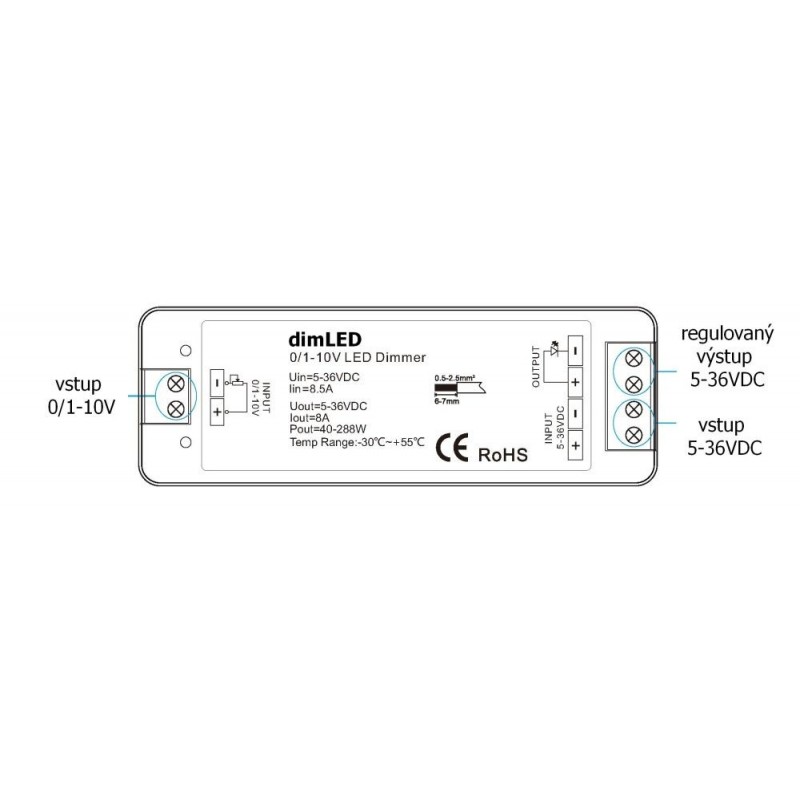 Stmívač je ovládán řídicím signálem 0-10V nebo 1-10V, který využívají některé ovládací zařízení. Je kompatibilní s aktivním i pasivním ovládáním 0-10V a 1-10V. Pomocí tohoto stmívače můžete jednoduše ovládat jakékoliv LED světelné zařízení se vstupním napětím 5-36V DC.