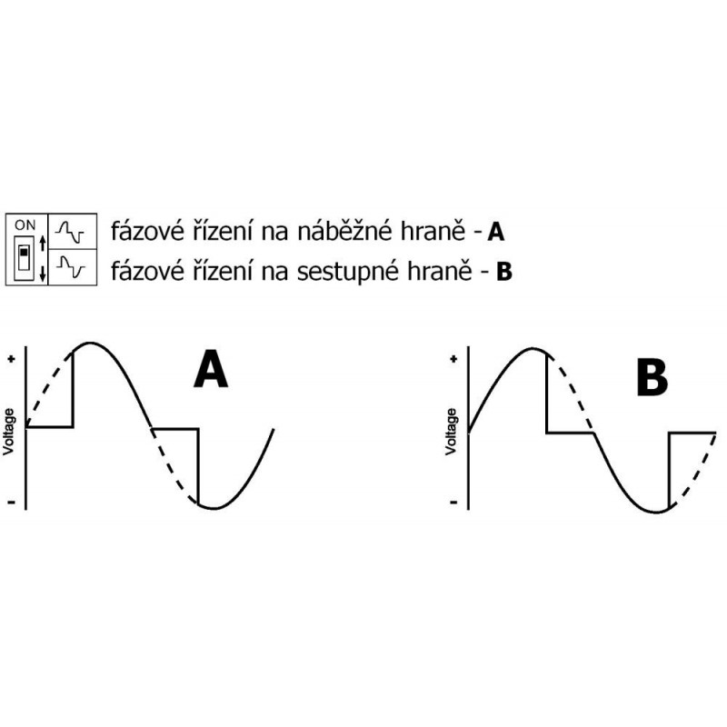 | Způsob stmívání | ořezávání půlvlny na vzestupné nebo sestupné hraně dle nastavení |