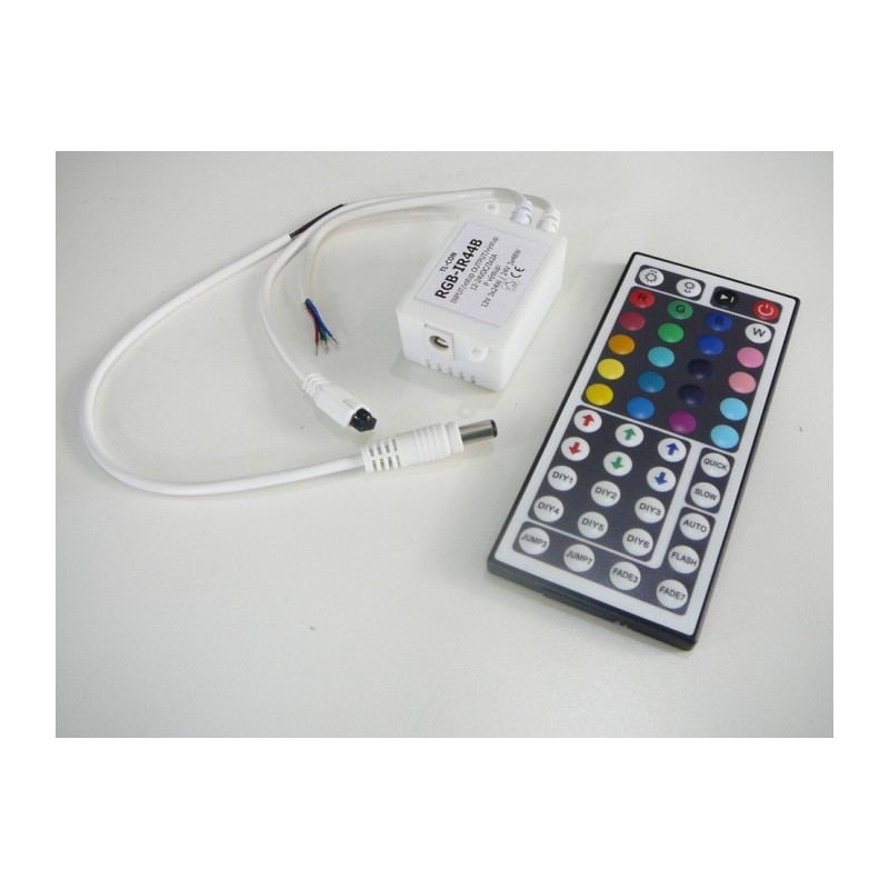 Programy : 44 tlačítek, 20 přednastavených barev, 6 předvoleb pro vlastní nastavení barvy, přepínání nebo prolínání 3 nebo 7 barev, 1 automatický program střídá všechny efekty ovladače, možnost nastavení intenzity jasu a rychlosti změny barev