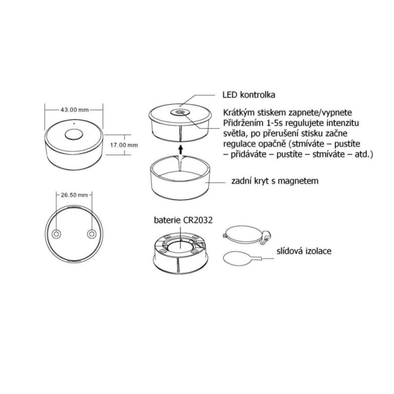 Dálkový ovladač dimLED OV MK1 je bezdrátový radiofrekvenční ovládací systém, jednoho ovladače a několik přijímačů. S jedním ovladačem lze ovládat 1 zónu, která se může skládat z několika přijímačů. Tyto přijímače se po sehrání s ovladačem ovládají jako jedna sekce. Zadní kryt ovladače obsahuje magnet díky kterému můžete ovladač připevnit na magnetické povrchy.