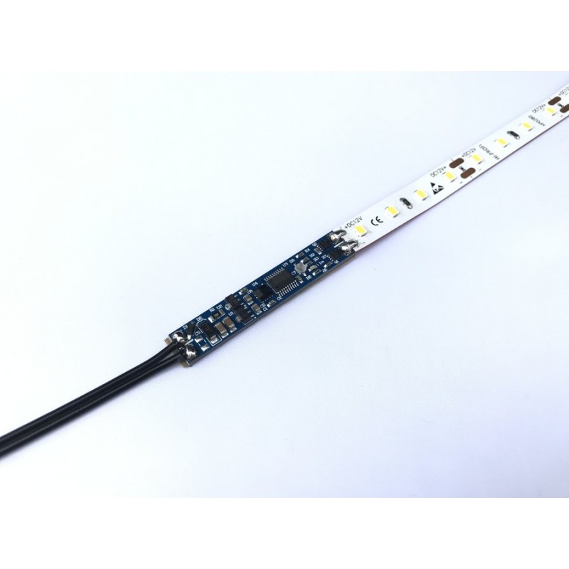 Miniaturní stmívač pro LED do ALU profilů s bezdotykovým senzorem.Ovládání pohybem ruky 2-15 cm pod instalovaným profilem. Jedná se o Detektor přiblížení. Při instalaci není nutno upravovat difuzor. Kontrolér obsahuje paměť nastavené intenzity osvětlení - při zapnutí naběhne na stejnou intenzitu osvětlení jakou měl před vypnutím. Má plynulý náběh světla. Ovladač je nutno v liště podlepit!