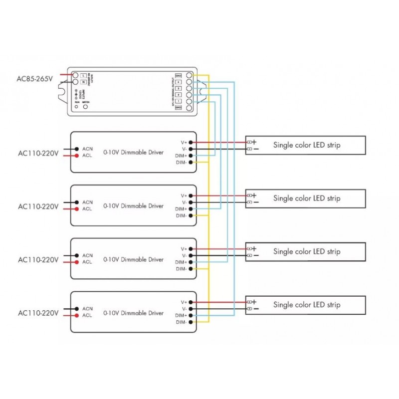 Ovladač dimLED RF 0-10V 4CH funguje jako ovladač, s kterým ovládáte svítidla se signálem 0-1/10V. K ovladači 069333 RF 0-10V 4CH následně párujete Vámi vybrané jednobarevné ovladače dimLED (například dimLED 1KR, LINEA S a další), případně můžete zakoupit vícekanálový ovladač (například OVL 4KL a další) a napárovat ovladač 069333 jako jednu ze zón. V obou těchto případech všechny 4 výstupy signálu fungují synchronně, tedy ovládají se najednou a slouží především k připojení 4 různých svítidel, které chcete ovládat najednou. V případě že chcete ovládat více zón samostatně, je nutné dokoupit více ovladačů 069333 RF 0-10V 4CH.
