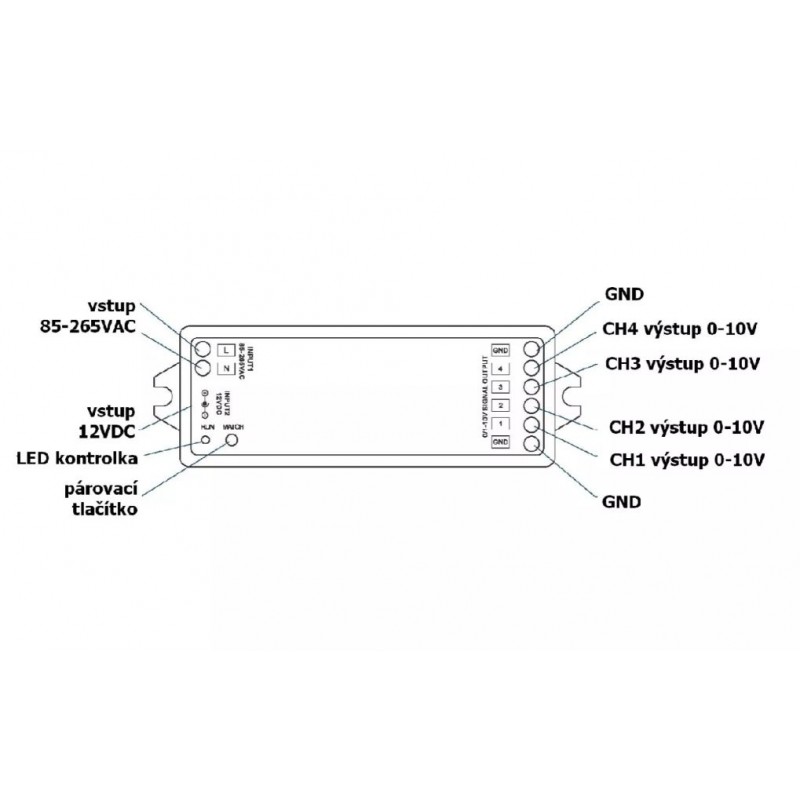 Ovladač dimLED RF 0-10V 4CH je určen pro ovládání zařízení ovládaná řídicím signálem 0-10V nebo 1-10V v systému dimLED. Je kompatibilní s aktivním i pasivním ovládáním 0-10V a 1-10V. Pomocí tohoto ovladače a kombinace ovladačů dimLED můžete ovládat Vaše určená svítidla s tímto vstupním signálem například pomocí RF ovladačů dimLED.