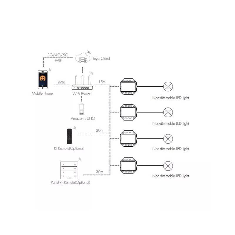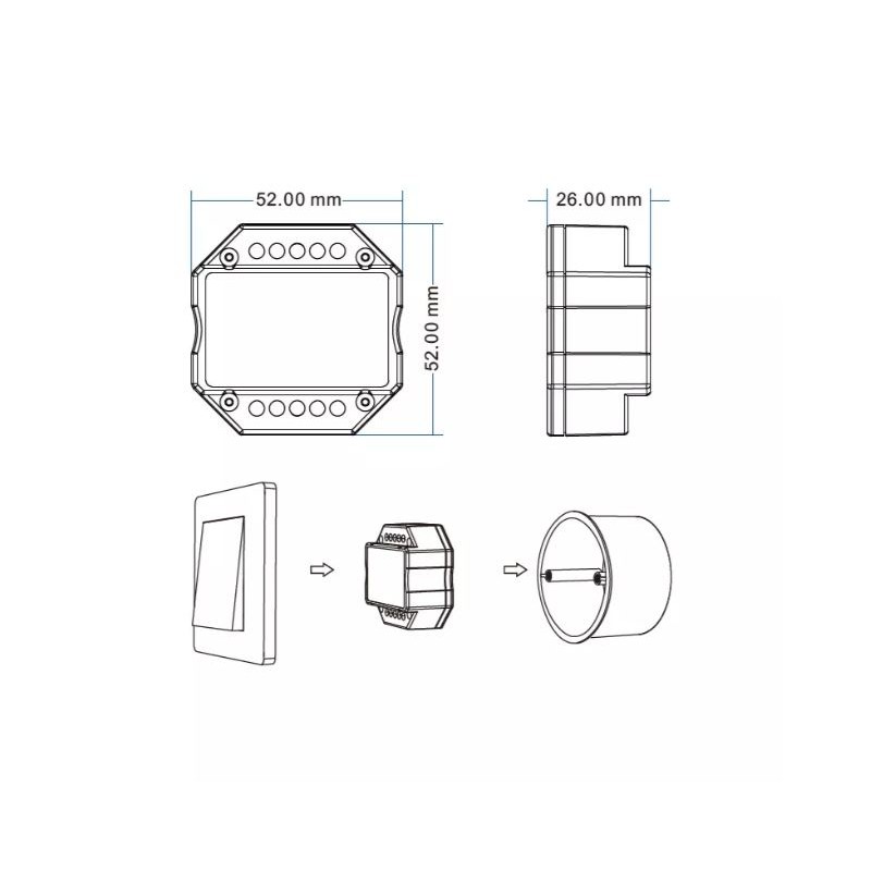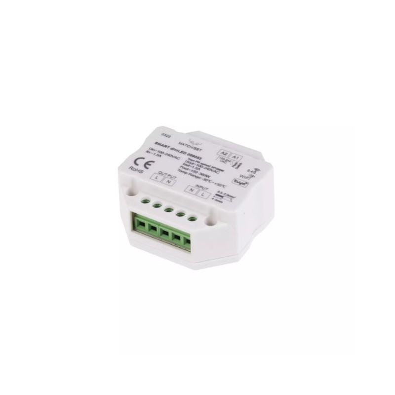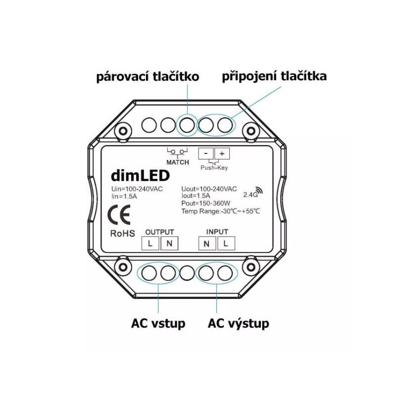 Přijímač je kompatibilní se všemi ovladači řady dimLED, aplikací Tuya, Amazon Alexa (ECHO) a zároveň má přijímač svorkovnici pro připojení tlačítka, kterým lze přijímač manuálně ovládat.