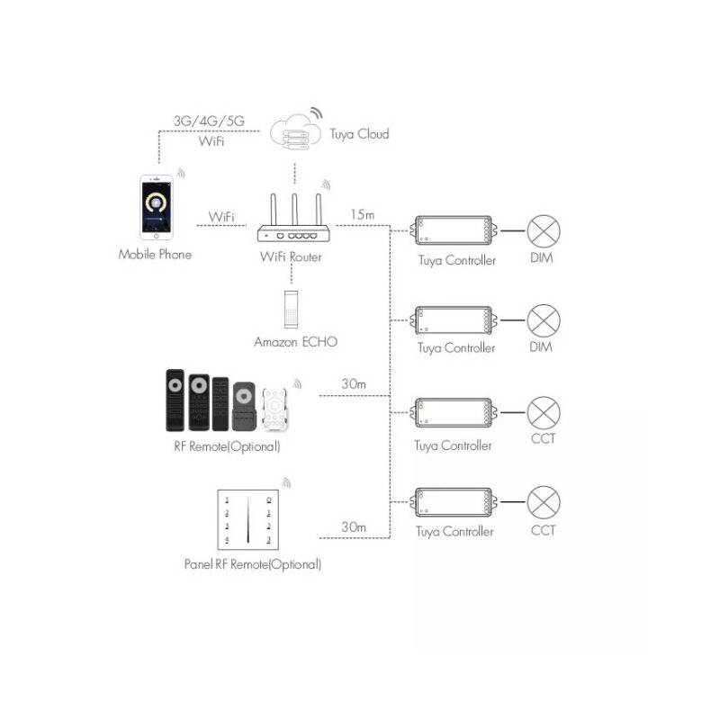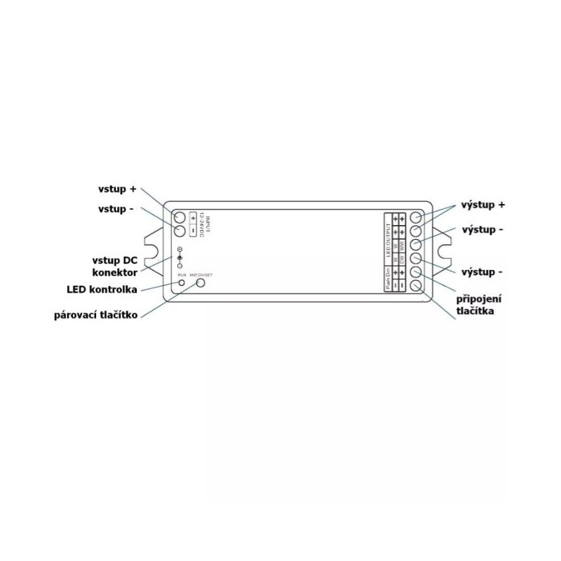 Přijímač je kompatibilní se všemi ovladači řady dimLED, aplikací Tuya, Amazon Alexa (ECHO) a zároveň má přijímač svorkovnici pro připojení tlačítka, kterým lze přijímač manuálně ovládat.