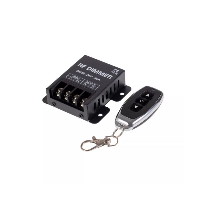 Stmívač a vypínač jednokanálový RF - radiofrekvenční dálkové ovládání intensity jasu LED pásků, stmívatelných LED žárovek 12-24V a jednobarevných modulů. Přijímač může být ukrytý (za zdí, sádrokartónem či ve skříni), není nutná přímá viditelnost přijímače pro ovladač.