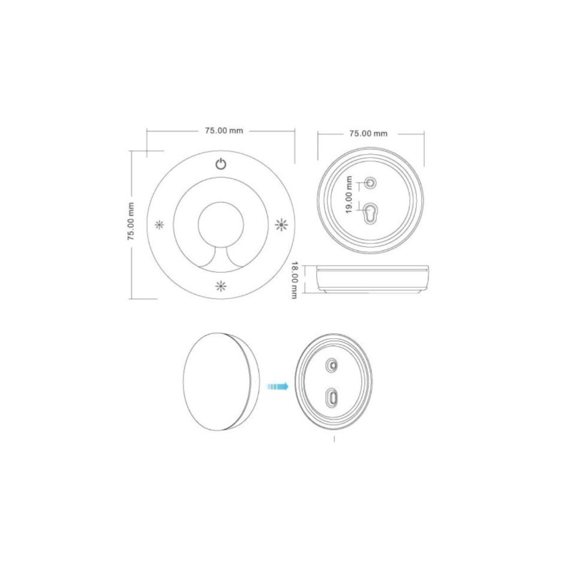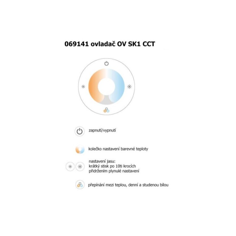 Dálkový ovladač dimLED OV BSK1 S je bezdrátový radiofrekvenční ovládací systém, jednoho ovladače a několik přijímačů. Ovladač je určený pro ovládání CCT osvětlení jako jsou například CCT LED pásky nebo jiná CCT svítidla. S jedním ovladačem lze ovládat 1 zónu, která se může skládat z několika přijímačů. Tyto přijímače se po sehrání s ovladačem ovládají jako jedna sekce. Přijímač může být ukrytý (za zdí, sádrokartónem či ve skříni), není nutná přímá viditelnost přijímače pro ovladač.
