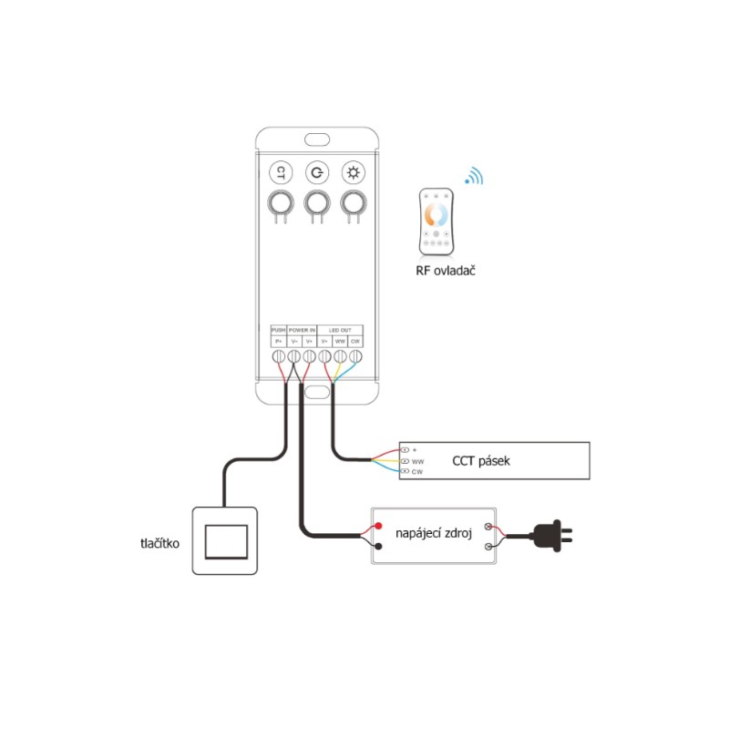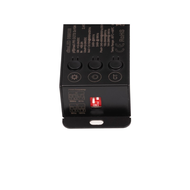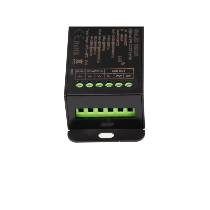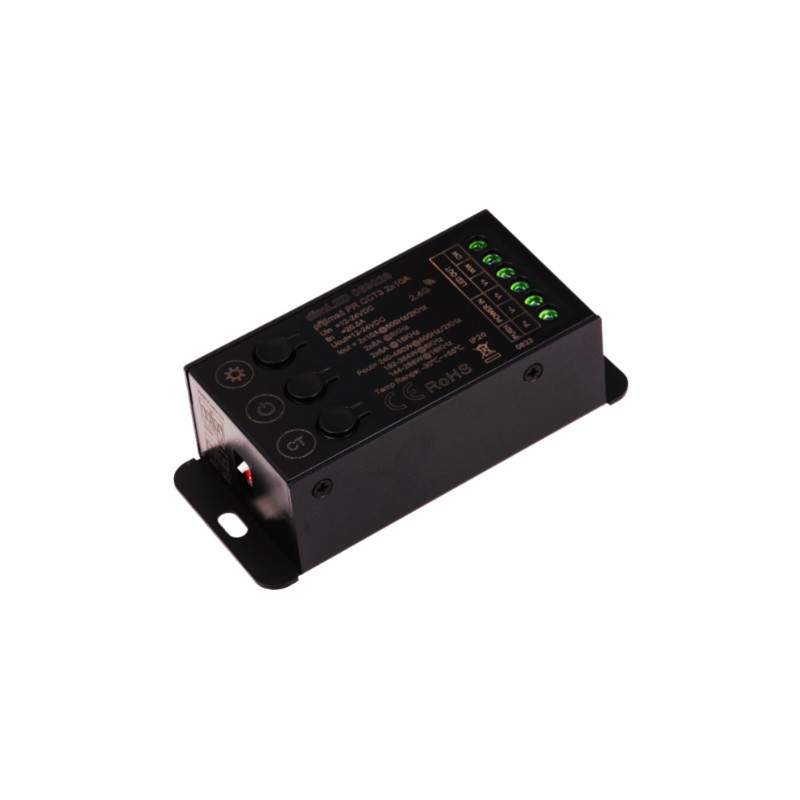 Radiofrekvenční přijímač stmívač pro CCT LED osvětlení s napětím 12-24V DC. Přijímač je kompatibilní se všemi ovladači řady dimLED. Přijímač může být ukrytý (za zdí, sádrokartónem či ve skříni), není tedy nutná přímá viditelnost přijímače pro ovladač. Přijímač má svorkovnici pro připojení tlačítka, kterým lze přijímač manuálně ovládat (zapínat, vypínat a stmívat). Přijímač lze tedy ovládat jak dálkově pomocí ovladače do ruky, tak manuálně externím tlačítkem. Na samotném přijímači jsou také 3 tlačítka pro vypnutí/zapnutí. Pro ovládání více okruhů je nutno použít jeden přijímač na každý okruh. Na každý přijímač lze napárovat až 10 různých ovladačů řady dimLED a tak ovládat z několika míst najednou. V případě přerušení a poté opětovného připojení napájení (například přerušením napájení zdroje) má tento přijímač paměť nastavení intenzity (intenzita osvětlení se vrátí na naposled nastavenou).