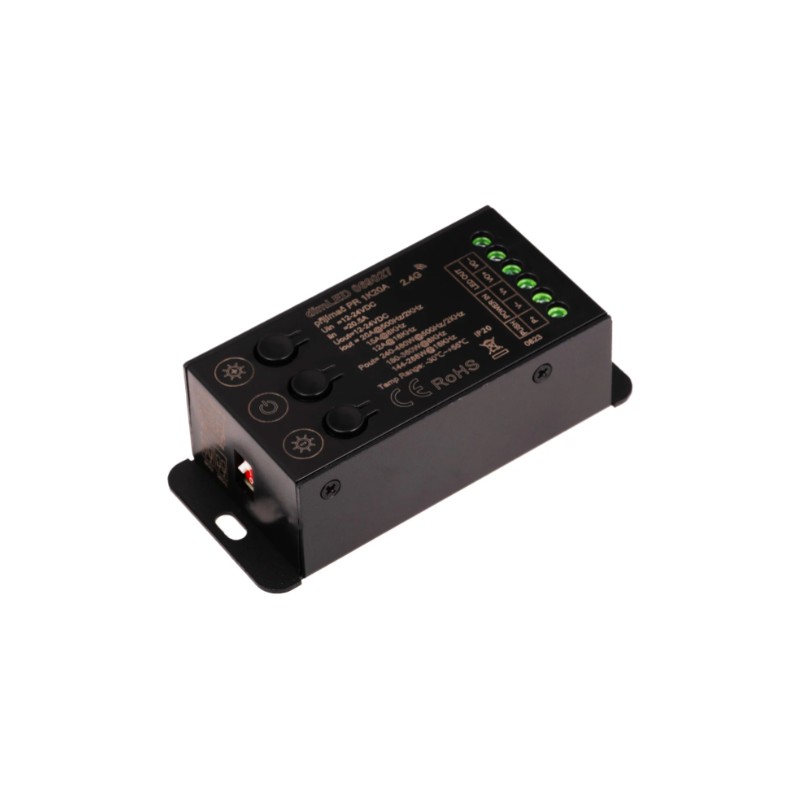 Radiofrekvenční přijímač stmívač pro jednobarevné LED osvětlení s napětím 12-24V DC. Přijímač je kompatibilní se všemi ovladači řady dimLED. Přijímač může být ukrytý (za zdí, sádrokartónem či ve skříni), není tedy nutná přímá viditelnost přijímače pro ovladač. Přijímač má svorkovnici pro připojení tlačítka, kterým lze přijímač manuálně ovládat. Přijímač lze tedy ovládat jak dálkově pomocí ovladače do ruky, tak manuálně externím tlačítkem. Na samotném přijímači jsou také 3 tlačítko pro vypnutí/zapnutí. Pro ovládání více okruhů je nutno použít jeden přijímač na každý okruh. Na každý přijímač lze napárovat až 10 různých ovladačů řady dimLED a tak ovládat z několika míst najednou. V případě přerušení a poté opětovného připojení napájení (například přerušením napájení zdroje) má tento přijímač paměť nastavení intenzity (intenzita osvětlení se vrátí na naposled nastavenou).