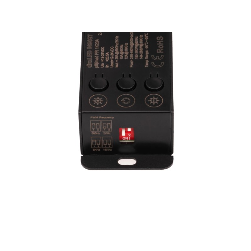 Tento model přijímače dimLED umožňuje nastavit 4 hodnoty PWM frekvence. S vyšší frekvencí klesá výstupní proud, nicméně vyšší frekvence je vhodná pro instalace například s kamerami (no flicker pro video). Hodnoty frekvencí a výstupního proudu jsou: