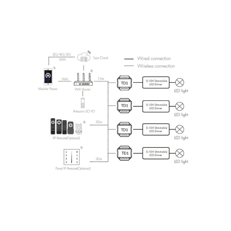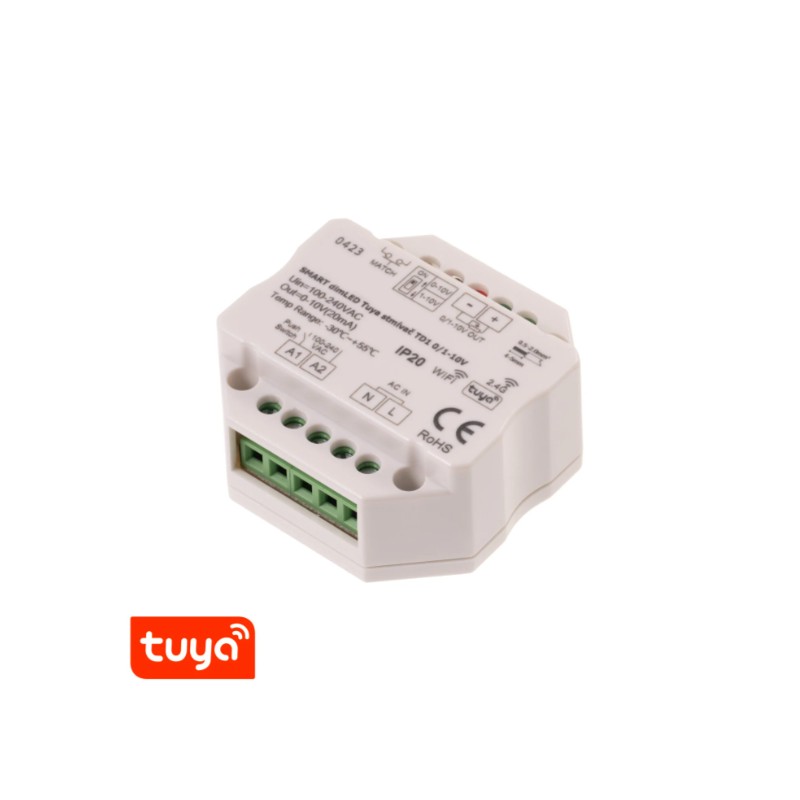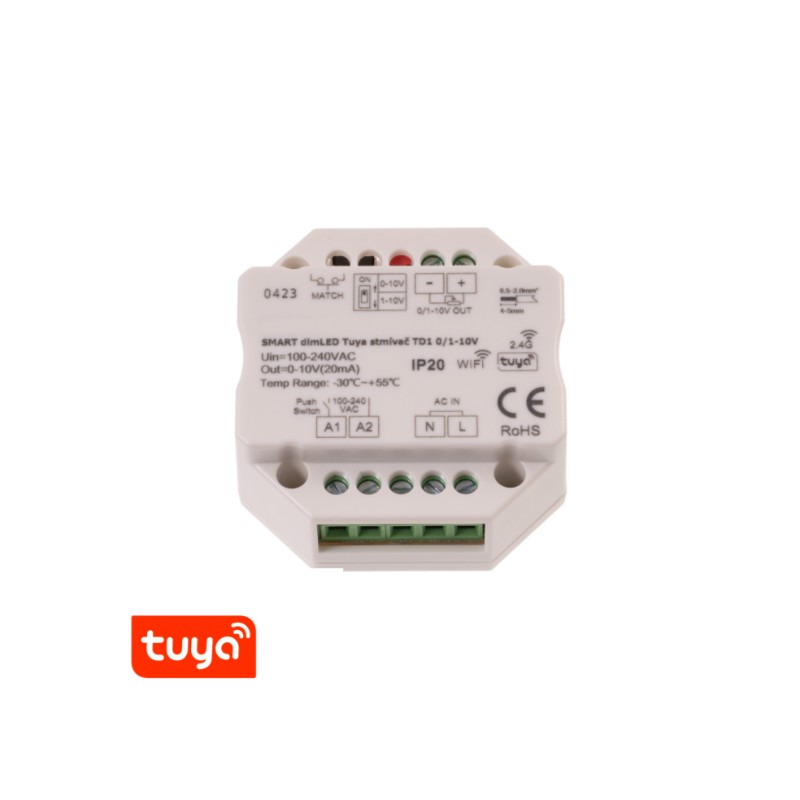 Chytrý radiofrekvenční stmívač pro ovládání zdrojů nebo světel s řízením 0-10V a 1-10V s podporou aplikace Tuya. Přijímač může být ukrytý (za zdí, sádrokartónem či ve skříni), není nutná přímá viditelnost přijímače pro ovladač. Stmívač umožňuje při zapnutí náběh světla 0,5s nebo 3s. Stmívačem lze ovládat: