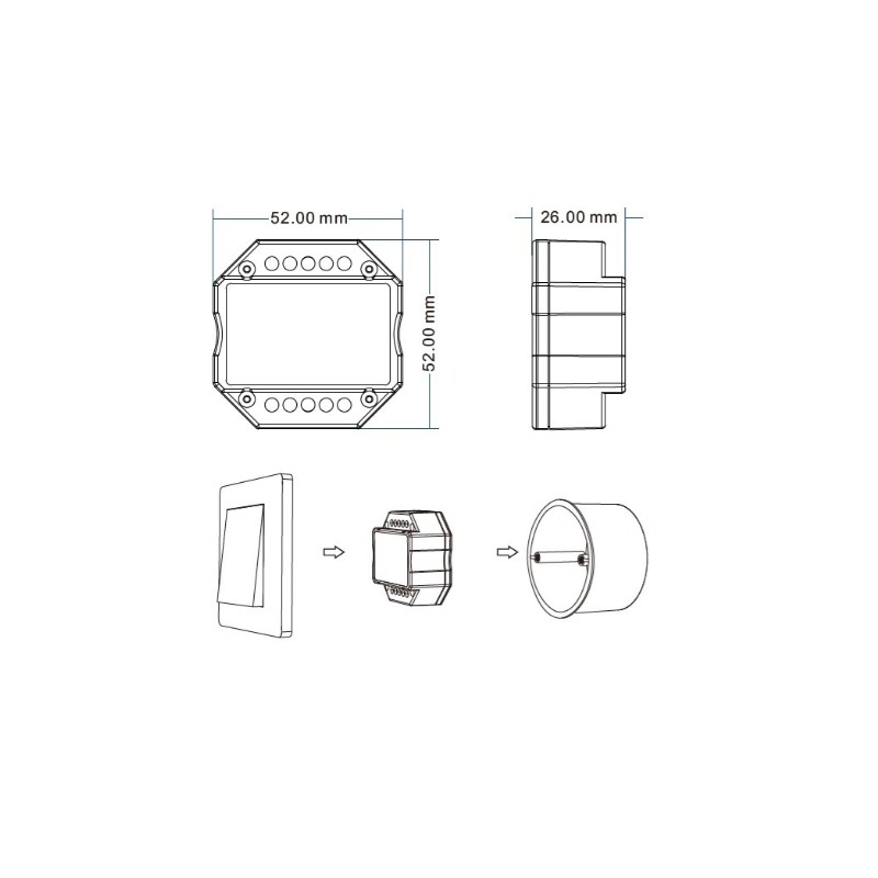 Přijímač je kompatibilní se ovladači řady dimLED, aplikací Tuya, Amazon Alexa (ECHO) a zároveň má přijímač svorkovnici pro připojení tlačítka, kterým lze přijímač manuálně ovládat.