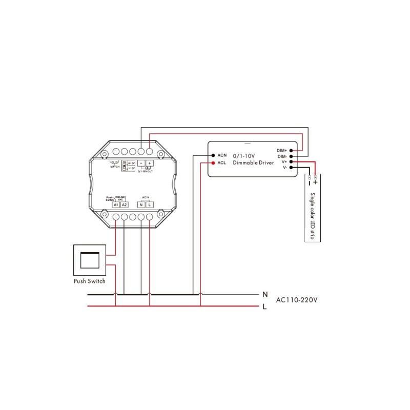 Pro ovládání více okruhů je nutno použít jeden stmívač na každý okruh. Doporučené zapojení max. 50 zdrojů s 0/1 10V ovládáním a maximální délka kabelu k 0/1 10V zdroji je 50m. Na každý stmívač lze napárovat až 10 různých ovladačů řady dimLED a tak ovládat z několika míst.
