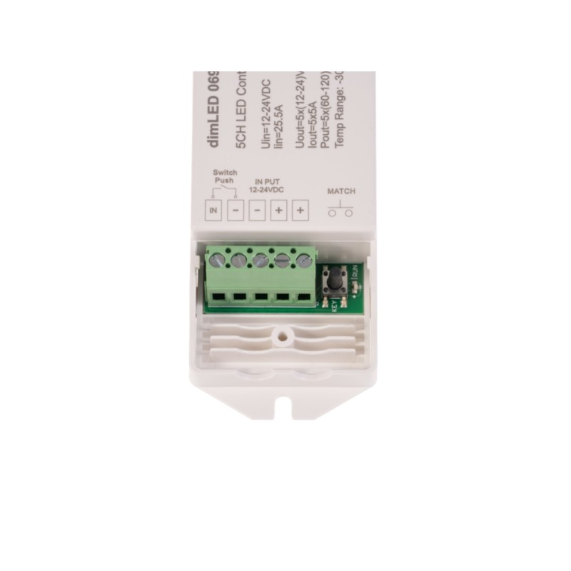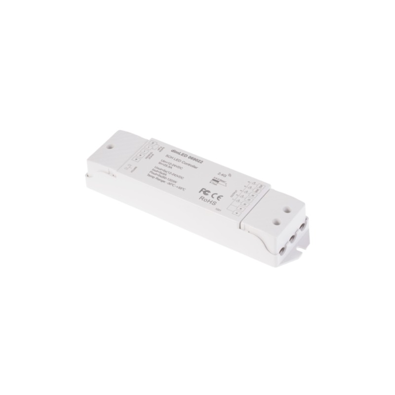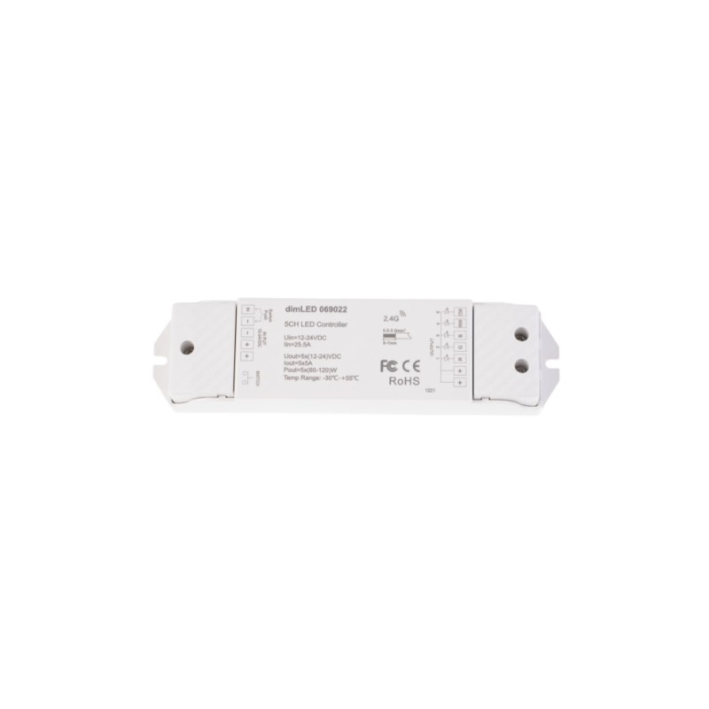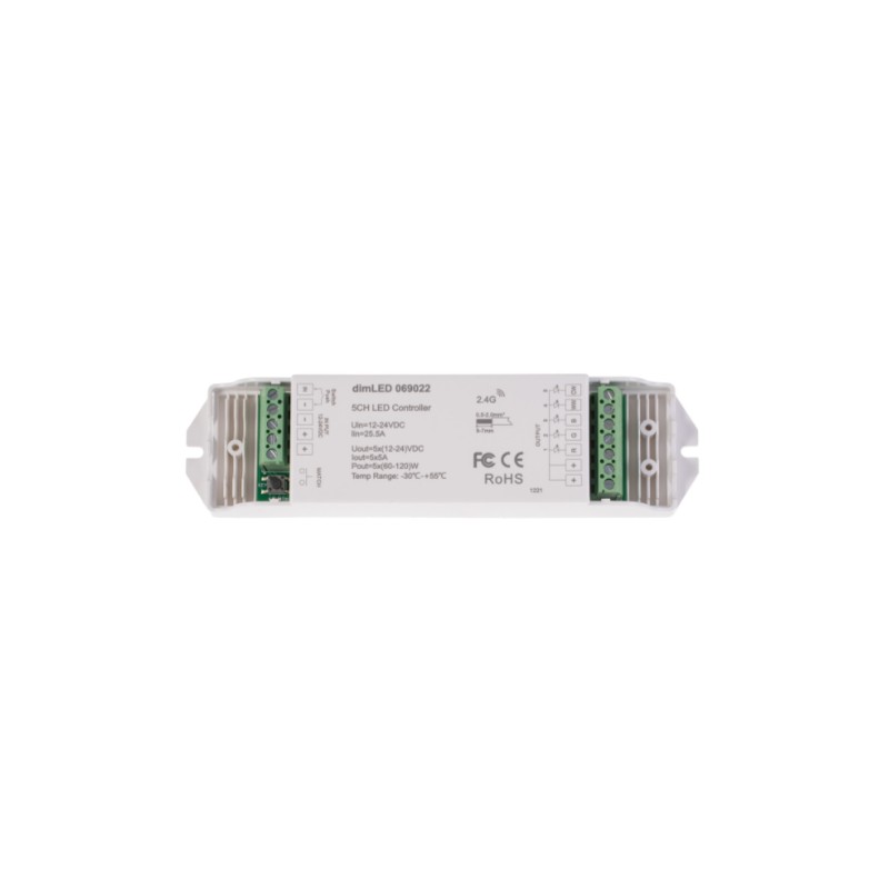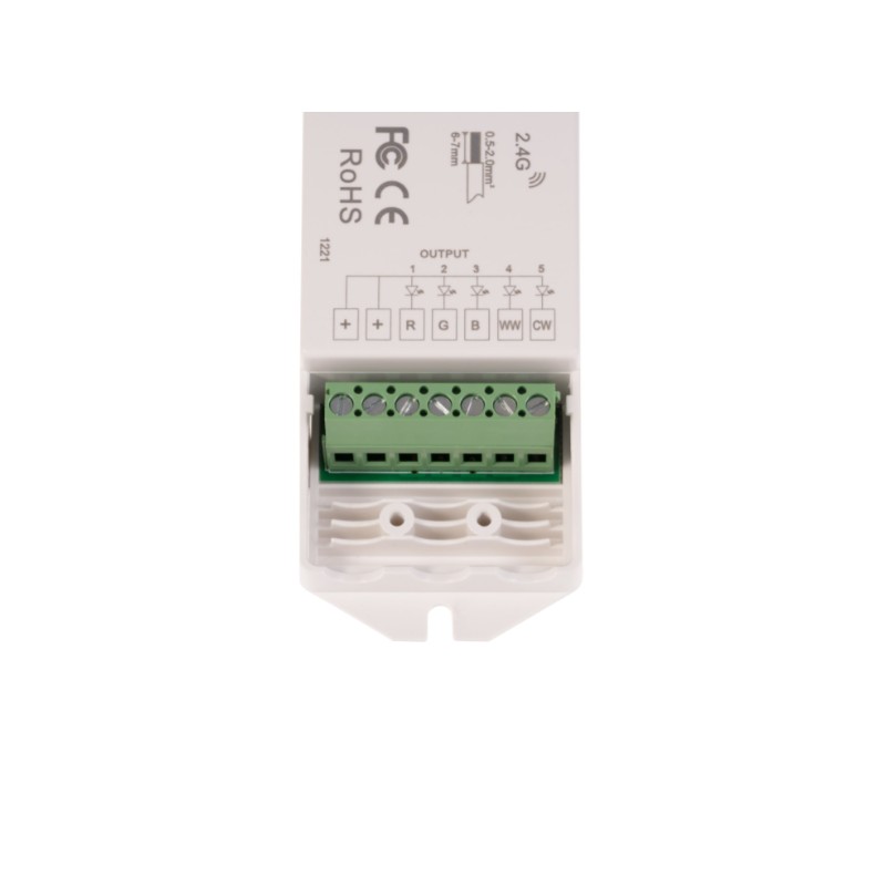 Radiofrekvenční přijímač stmívač pro RGBCCT LED produkty. Přijímač může být ukrytý (za zdí, sádrokartónem či ve skříni), není nutná přímá viditelnost přijímače pro ovladač. Pro ovládání více okruhů je nutno použít jeden přijímač na každý okruh. Na každý přijímač lze napárovat až 10 různých ovladačů řady dimLED a tak ovládat z několika míst.