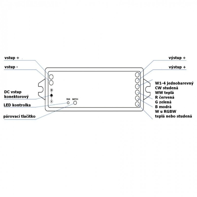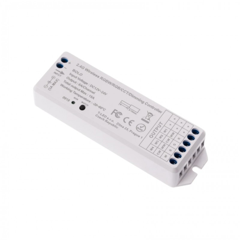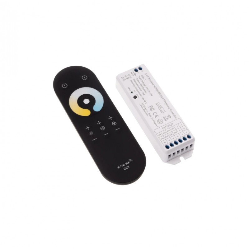Tento jednokanálový RF stmívač a vypínač umožňuje pohodlné dálkové ovládání i ovládání barvy a jasu CCT LED produktů na 12-24V DC jako jsou CCT LED pásky, CCT LED moduly a další. Díky radiofrekvenční technologii není nutná přímá viditelnost mezi ovladačem a přijímačem, což umožňuje skrytí přijímače za zdí, sádrokartonem nebo ve skříni.