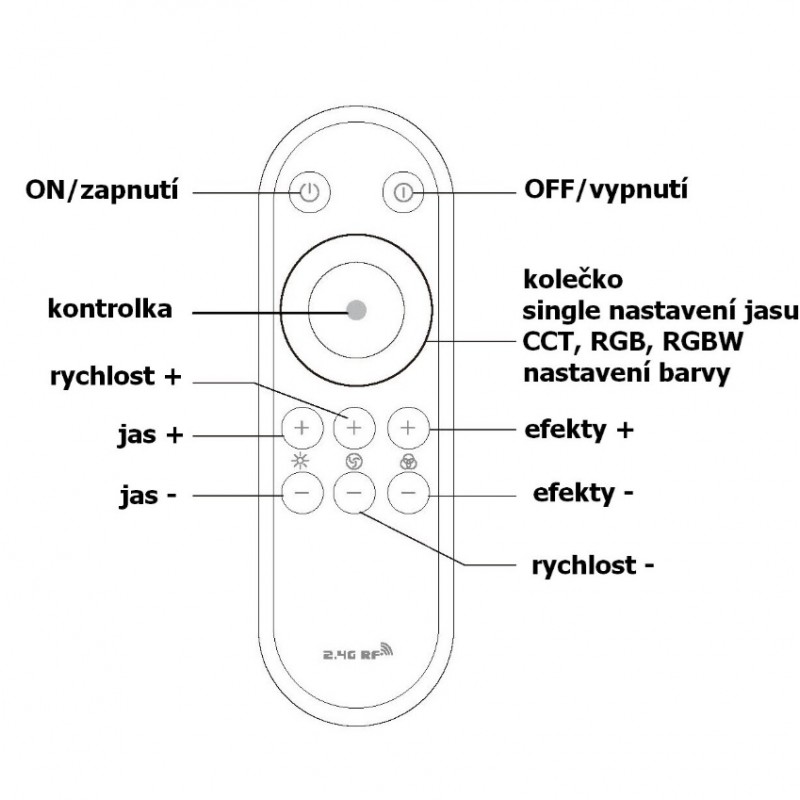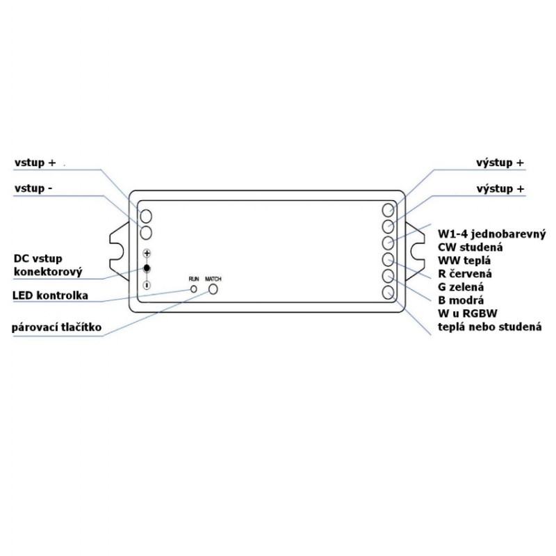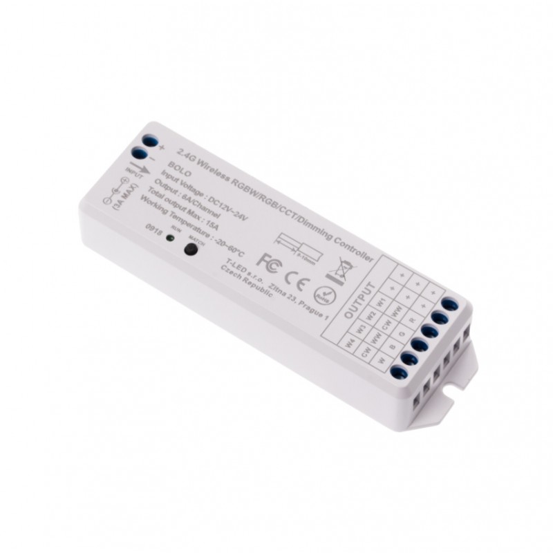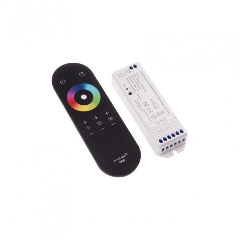 Tento jednokanálový RF stmívač a vypínač umožňuje pohodlné dálkové ovládání i ovládání barvy a jasu RGB LED produktů na 12-24V DC jako jsou RGB LED pásky, RGB LED moduly a další. Díky radiofrekvenční technologii není nutná přímá viditelnost mezi ovladačem a přijímačem, což umožňuje skrytí přijímače za zdí, sádrokartonem nebo ve skříni.