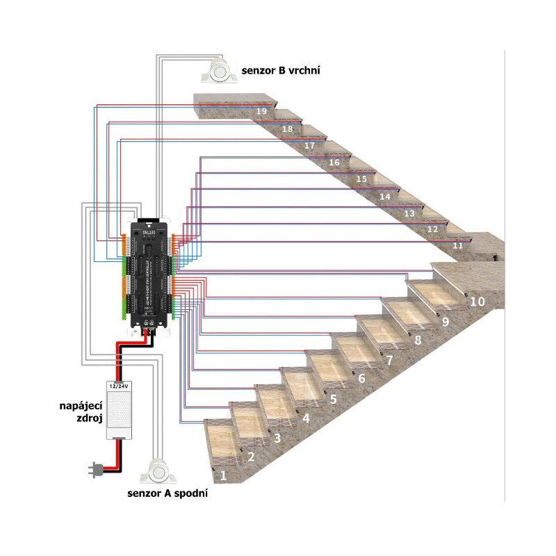 Ovladač pro osvětlení schodiště s PIR čidly, ovládání jednobarevných LED pásků