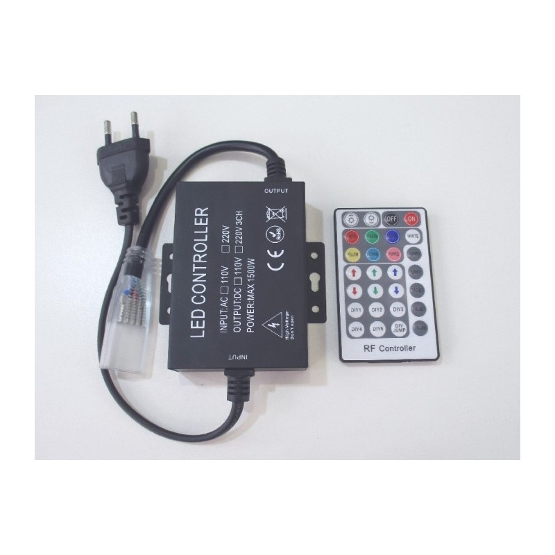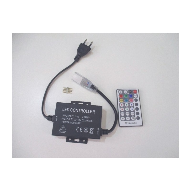 Programovatelný ovladač pro RGB LED pásky na 230V - RF (radiofrekvenční ovládání) umožňuje dálkově ovládat intensitu jasu, nastavení barev, barevných přechodů a jejich rychlost. Přijímač může být ukrytý (za zdí, sádrokartónem či ve skříni), není nutná přímá viditelnost přijímače pro ovladač.