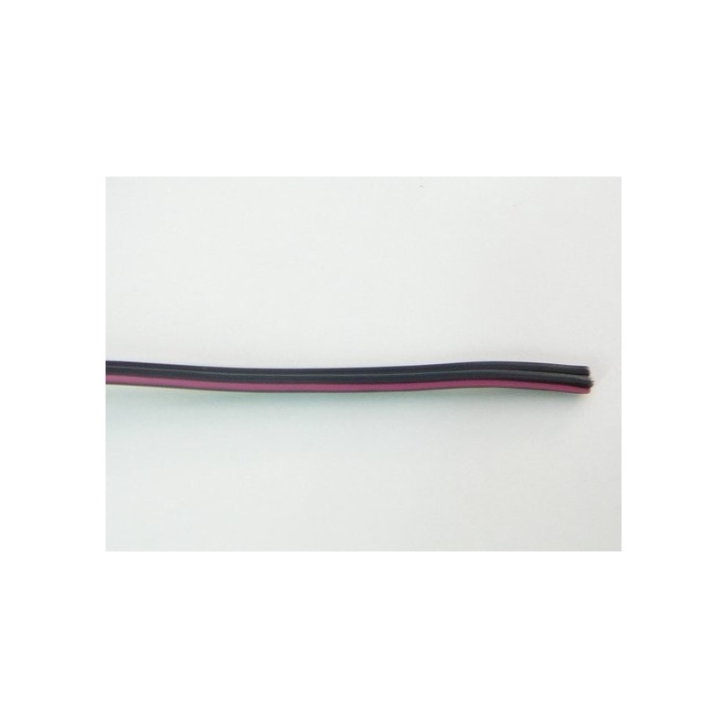 Dvoužilový plochý vodič s laněným měděným jádrem. Izolace je z černého PVC a jedna z žil je označena červeným pruhem.